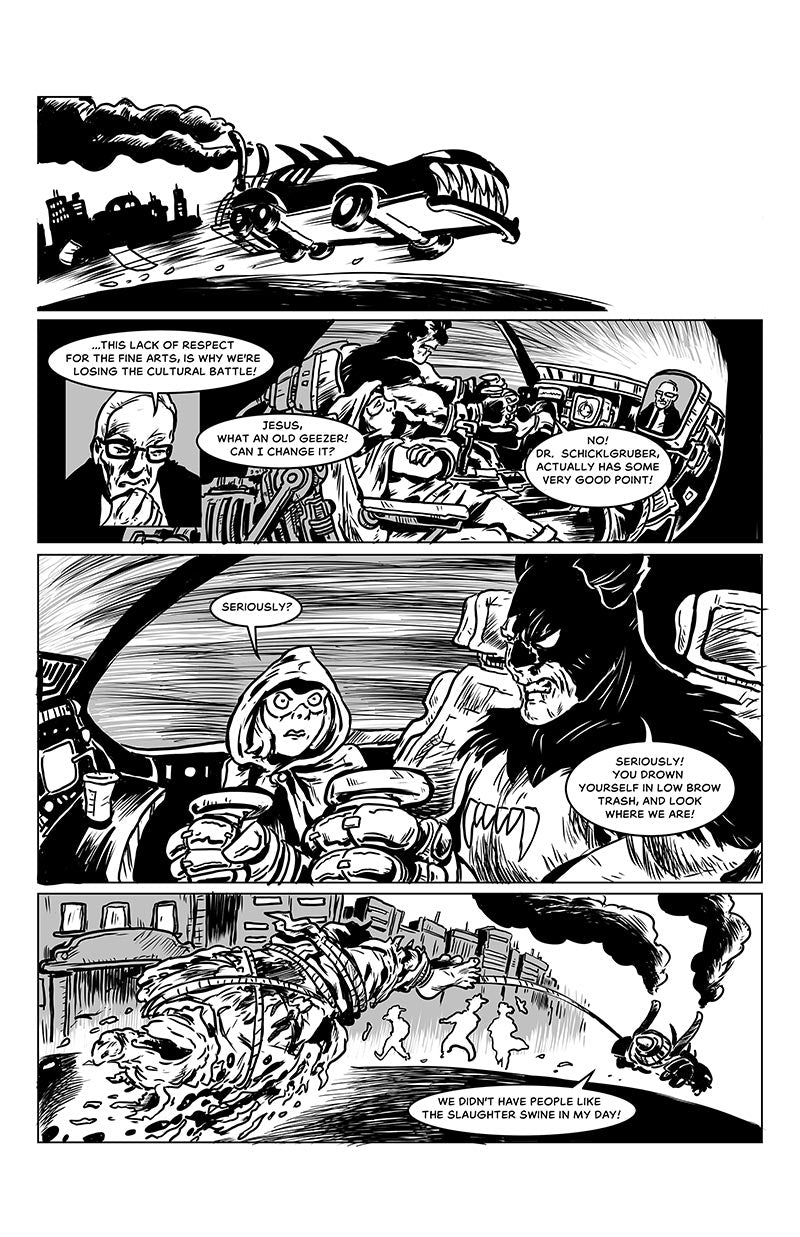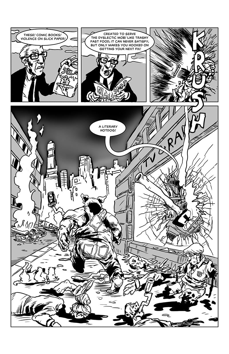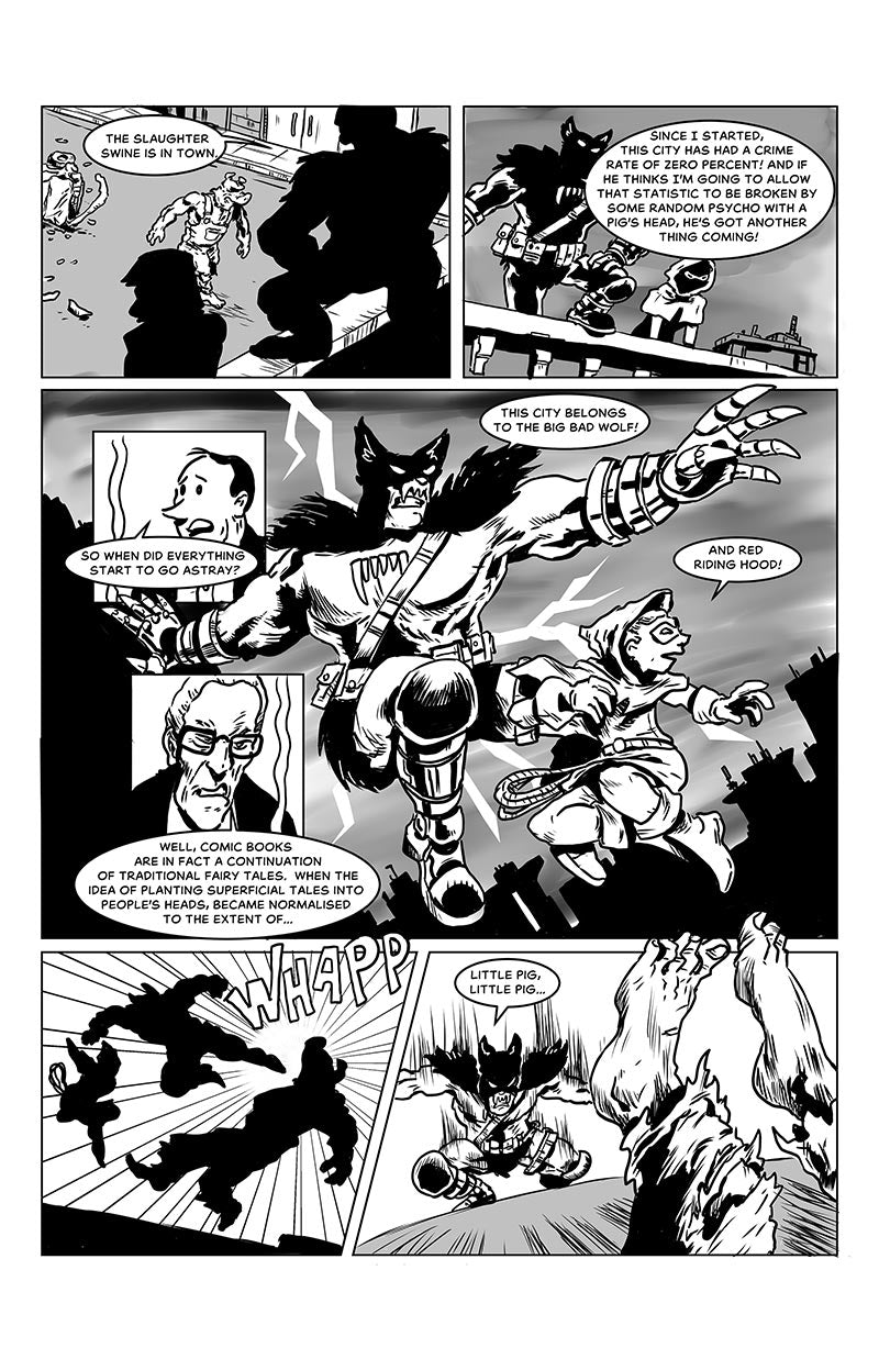 Chapter three follows superhero Big Bad Wolf and sidekick Little Red Riding Hood as they battle the Slaughter Swine, while Verden i dag examines comics as corrupting youth, citing Heino Svendsen as a cautionary example. Amid the chaos, the characters clash violently, with a nod to a real 1955 book adding an extra layer to the story.
